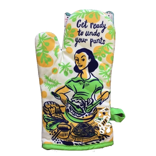 Confident in your home cooking? Tell your guests to get ready to undo those pants and serve up your comfort food with this hilarious oven glove.