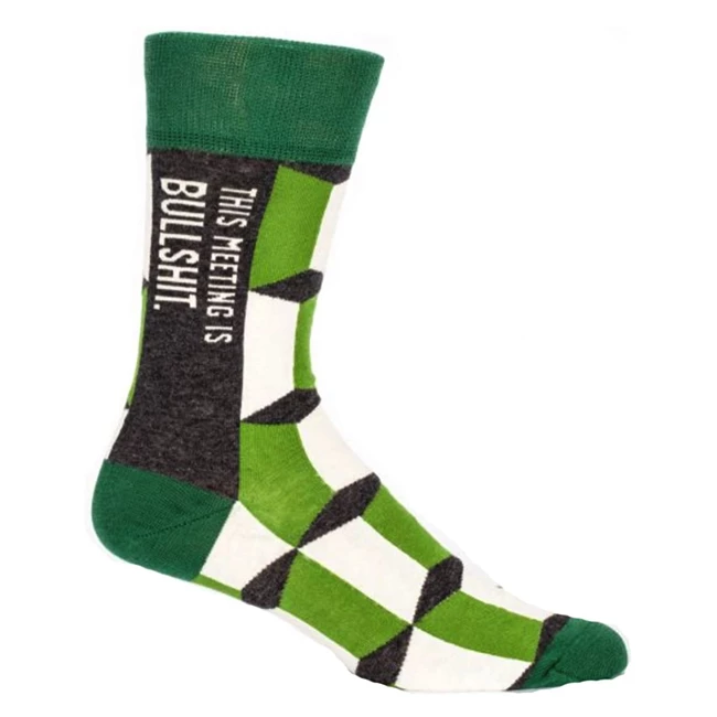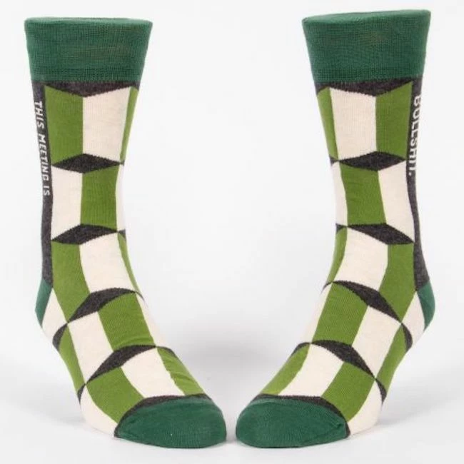 The ‘This Meeting Is Bullshit’ men’s socks feature bold text alongside a green and grey geometric pattern. Sit down, slip up your trouser leg and let your colleagues know your thoughts on the meeting!