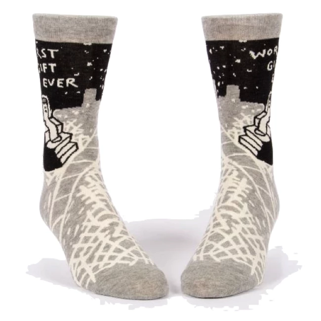 The ‘Worst Gift Ever’ men’s socks feature a sonber sock character on monochrome patterned fabric. Finally the opportunity to make gifting a pair of socks hilarious!