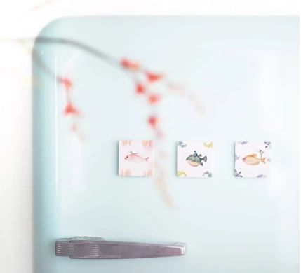 Enjoy your two-in-one Go with the Flow Mini Tile. This mini tile loves refrigerators and other iron surfaces. Use the magnetic back to place it. Prefer using the tile as a decorative art piece? Simply wet the enclosed hanging system and paste it at your chosen height. The system will enable you to hang the mini tile on a wall. Hand-made in Holland Heat and Water Resistant Welcome to the underwater world, where you’ll start your history filled ocean journey with these two captivating companions. Ride the mesmerising ocean current, admire the breathtaking ocean fauna and don’t forget to just go with the flow!