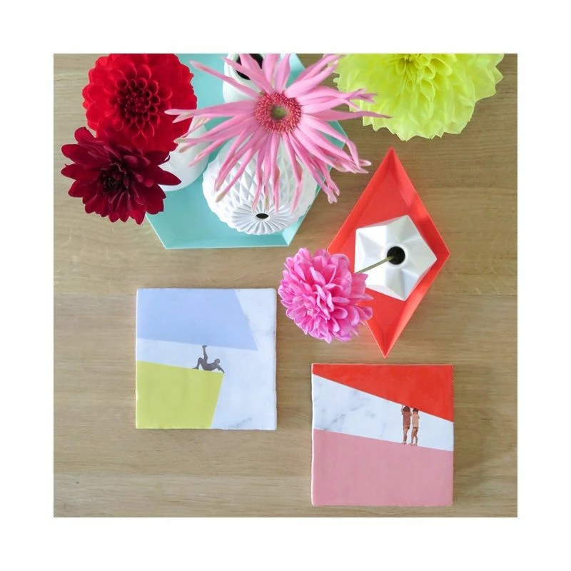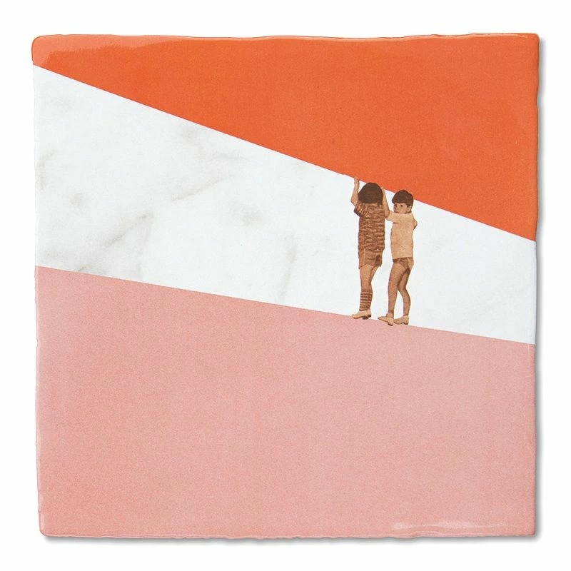Storytiles – “Adventurers” earthenware tile A storytiles earthenware tile with a cheerful design: two children ready for adventure! This minimalist wall decoration with its asymmetrical pink and orange color blocks, depicts two children enthusiastic about the idea of going on an adventure. This ceramic tile with contemporary decor is part of the “Kids” series. The story tiles can be hung on the wall like a painting or integrated into a composition in earthenware in the kitchen or bathroom, it can also be placed as a simple decorative object or trivet. At the end of the 16th century, ceramic tiles born in the Middle East reached the Netherlands. The first pottery manufacturers settled in Antwerp, then after the sack of their city, in Delft which quickly became a major center of ceramics. Delft ceramic tiles are renowned for their narrative decorations in white and blue imitating the colors of Ming porcelain. Marga van Oers, Dutch designer and artist reinvents this art of the Dutch ceramic tile with her Storytiles. Since 2013, its cut-out characters, its painted decorations, its colorful graphics, affixed with meticulousness on its earthenware tiles tell mini stories: those of childhood and the suspended time of the tale. These are handcrafted in the Netherlands. Ceramic fired at 830 ° – Metal hanging system on the back