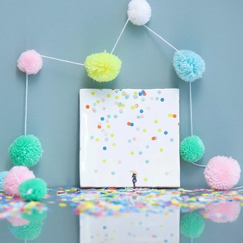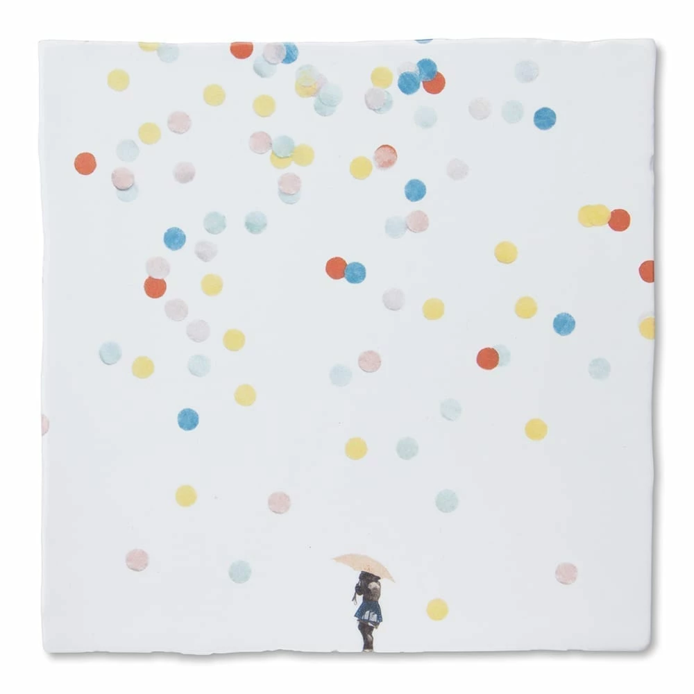 As part of the ‘A Paper World’ series, Under the umbrella is a reminder of the happiness and joy that colourful confetti can create such as enjoying romantic dances under a rain of confetti! When you add a dash of confetti to your home with this tile, you add a dash of fun and excitement to your life!