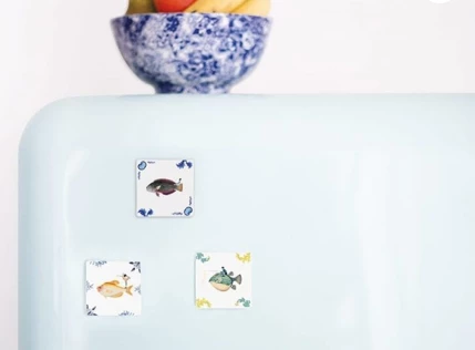 Enjoy your two-in-one Wave Rider Mini Tile. This mini tile loves refrigerators and other iron surfaces. Use the magnetic back to place it. Prefer using the tile as a decorative art piece? Simply wet the enclosed hanging system and paste it at your chosen height. The system will enable you to hang the mini tile on a wall. Hand-made in Holland Heat and Water Resistant Do you dare to ride the waves with this beautiful blue fish? Jump on its back, a whole sea adventure awaits you. This tile is part of the underwater world collection, created by StoryTiles in collaboration with the Natural History Museum in London.