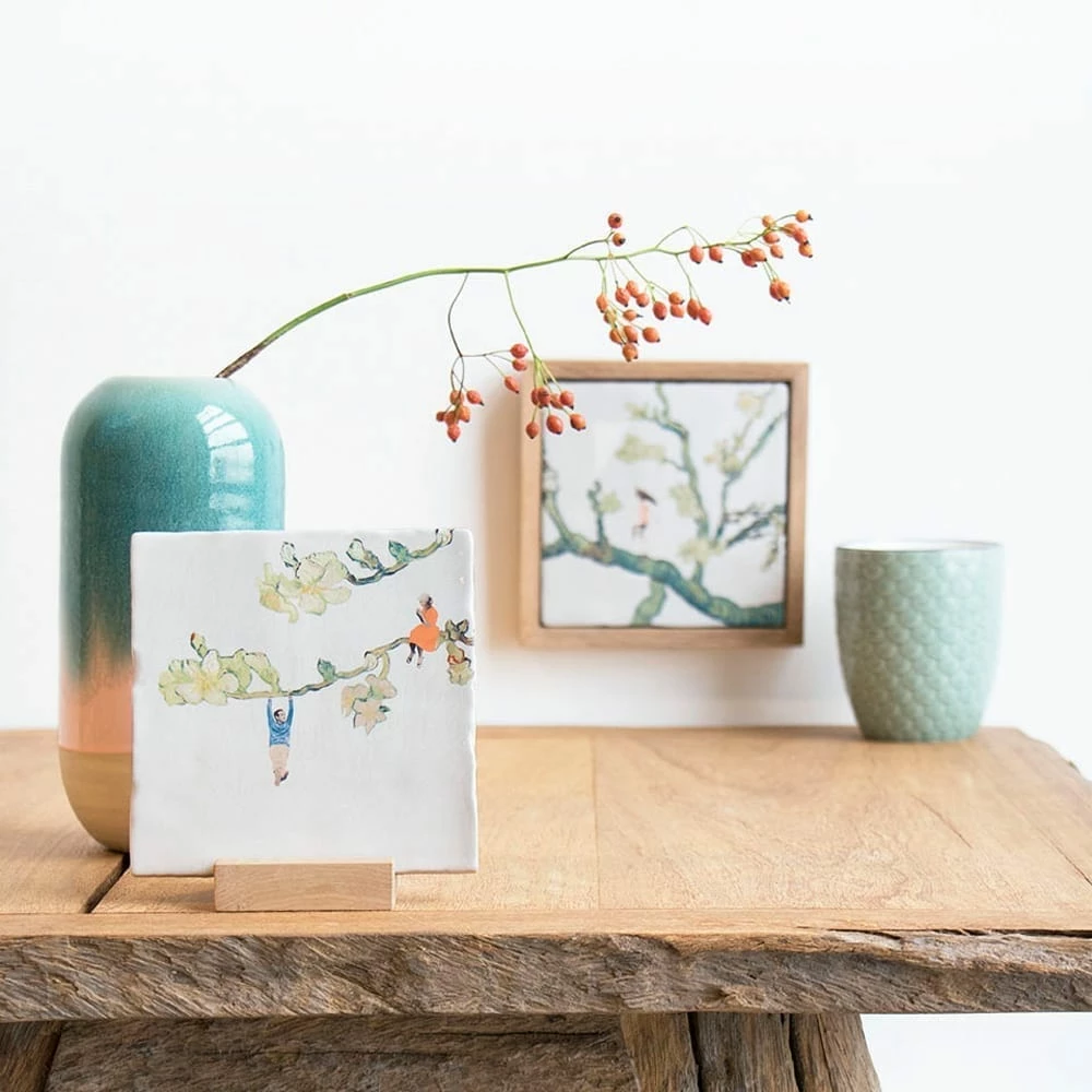 Ceramic tiles have been made in and around Delft, The Netherlands, since the 16th century. StoryTiles continues the tradition by creating miniature art-on-tiles. All tiles are baked in traditional Dutch ovens at a high temperature, what makes them heat and water resistant. Each design is unique, as it is hand baked and designed.