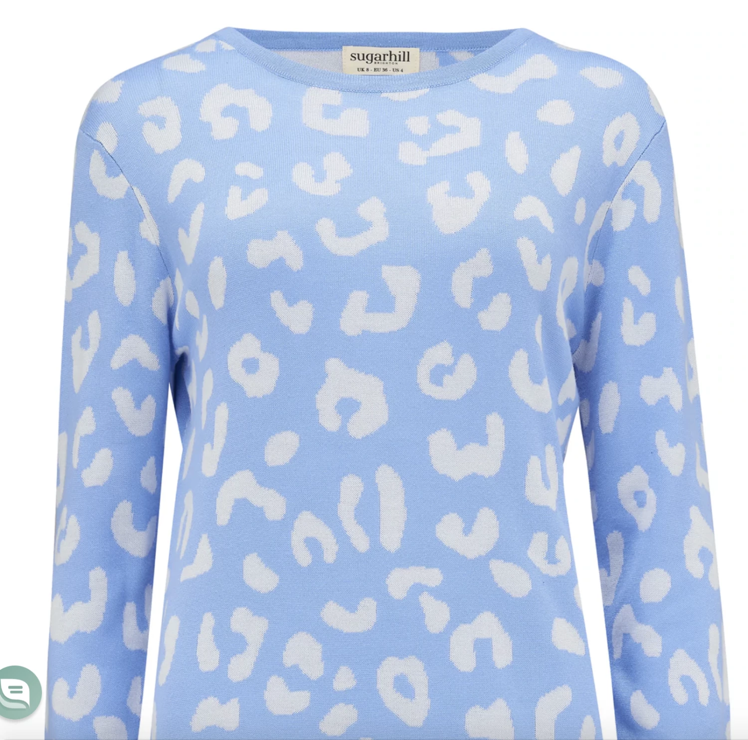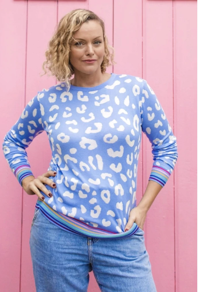 Our much loved Callie Jumper in a new colour, this soft blue and off-white leopard print sweater, with rainbow striped hem and cuffs, can be worn year round. Pure cotton ensures its longevity and softness, while the classic details like ribbed cuffs and hem and round neck make it a wardrobe staple.