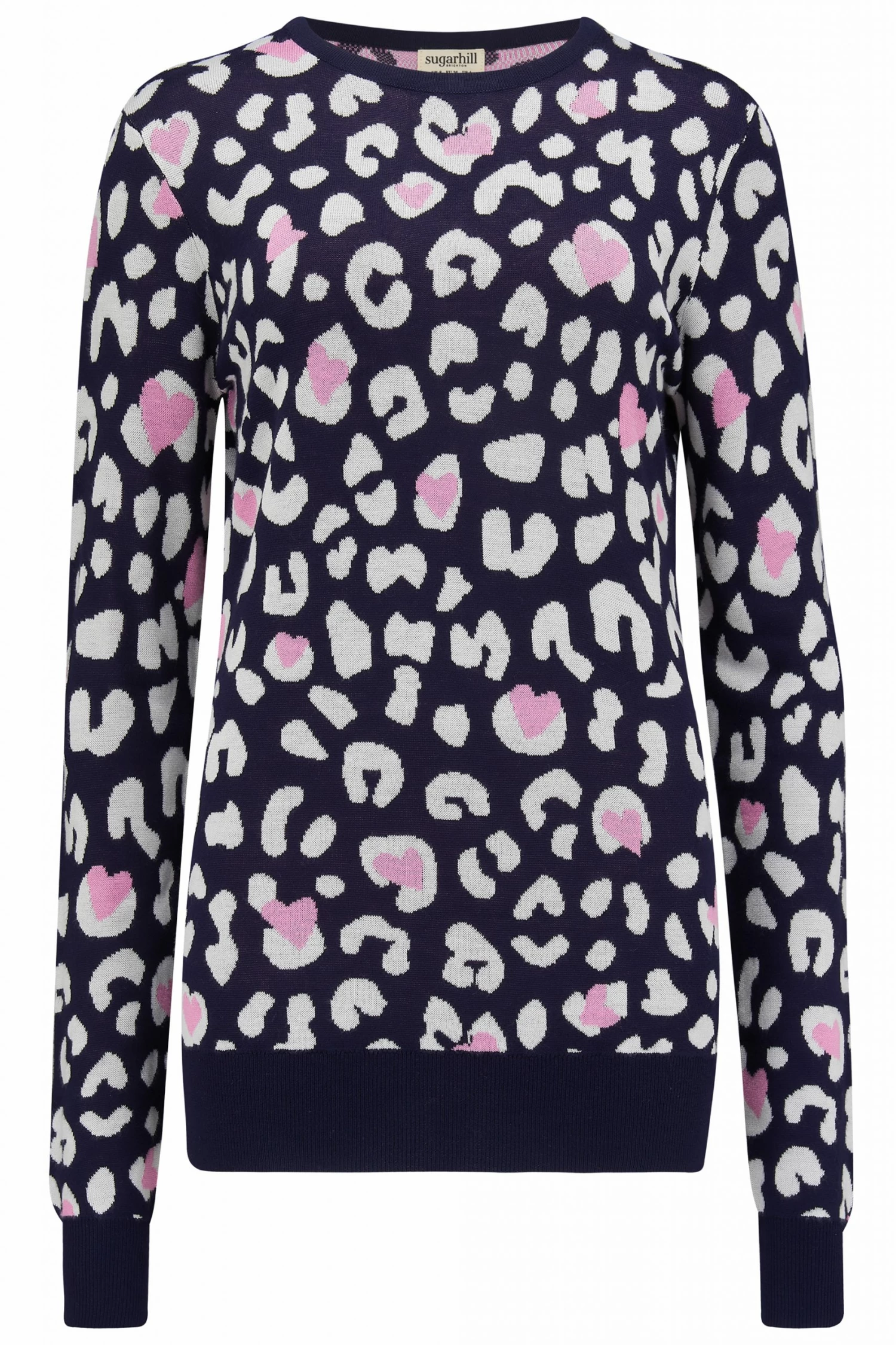 Our much loved Callie Jumper in a new colour, this navy blue pink and off-white leopard print sweater, with rainbow striped hem and cuffs, can be worn year round. Pure cotton ensures its longevity and softness, while the classic details like ribbed cuffs and hem and round neck make it a wardrobe staple.
