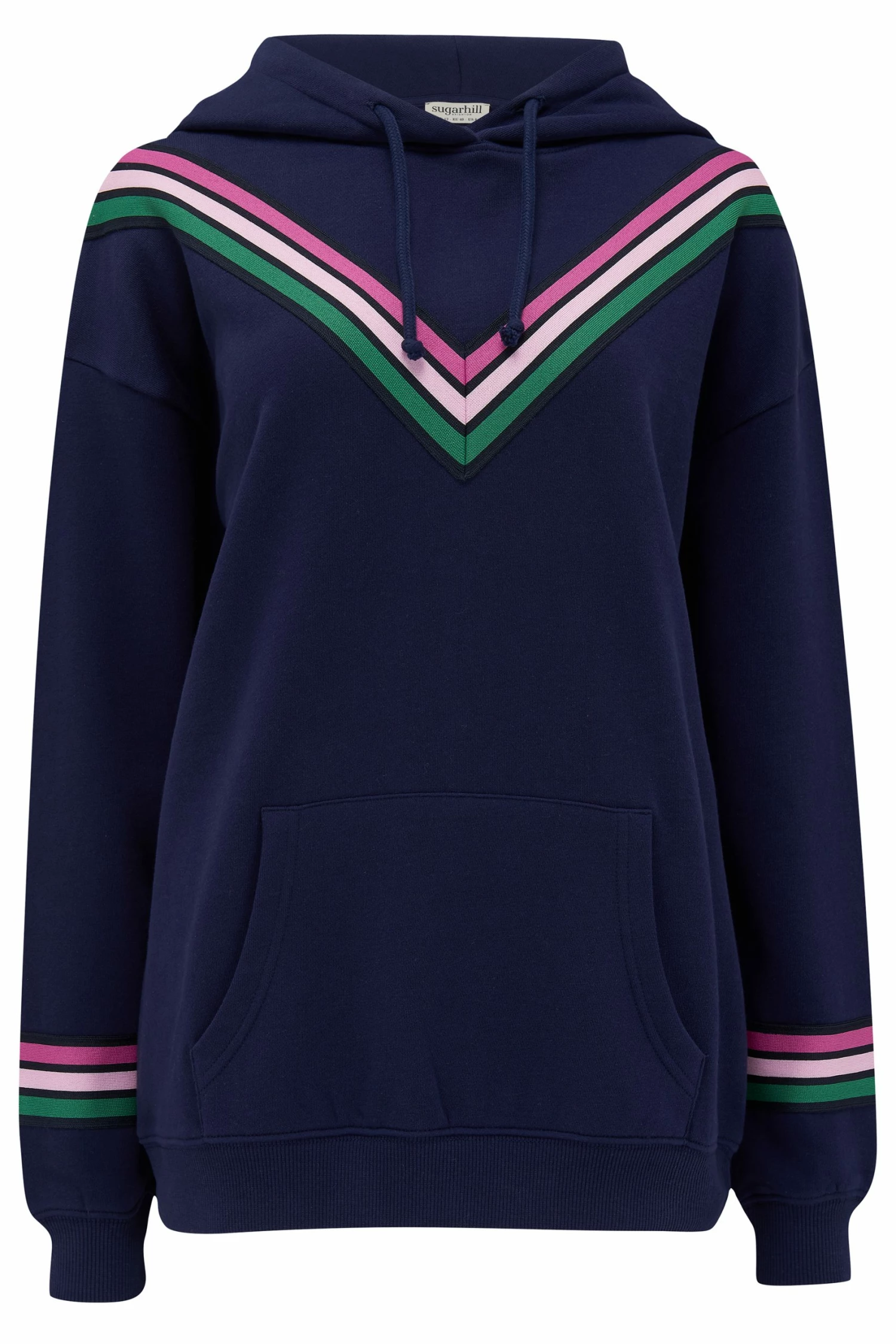 An easy to wear sporty hooded sweatshirt, featuring a three colour stripe trim on the cuffs and a chevron stripe across the front panel. The Jesse Hoodie has a flattering fit, ribbed collar and a drawstring hood.