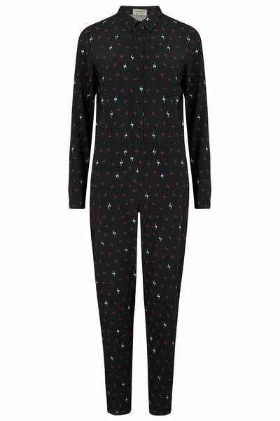 Sugarhill Brighton classic jumpsuit in a autumnal storm print. The lightning bolt motive across this black jumpsuit is in the perfect rust colours ready for autumn. 100% viscose Wash on a delicate cycle at 30 degrees with similar colours. C