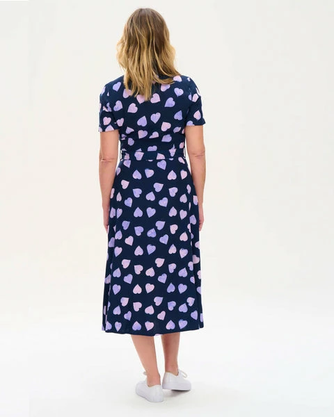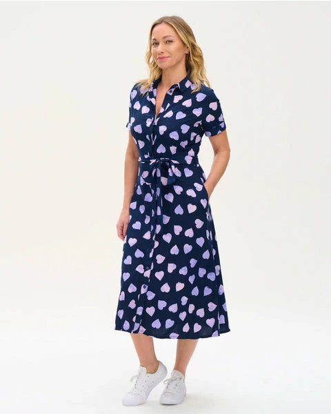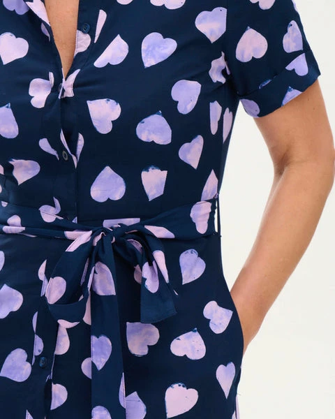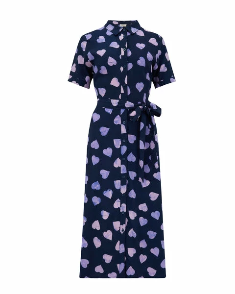 Beautiful Batik printed shirt dress top from British brand Sugarhill Brighton. The dress buttons up to the front, and has a traditional shirt style collar with a pretty tie waist belt paired with a longer length skirt. Printed all over with bold lilac hearts scattered on a deep navy base. 100% LENZING™ ECOVERO™ Viscose Wash at 30c