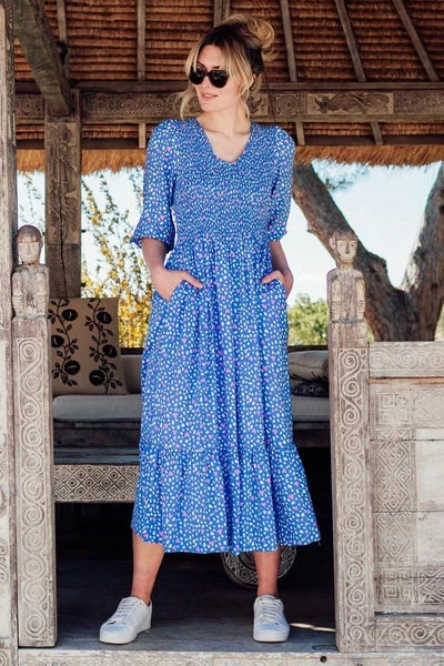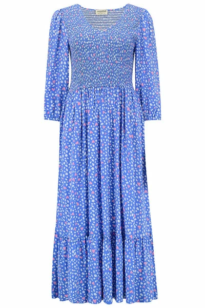 Sugarhill Brighton Magdalene Midi Shirred Dress Blue Animal Love Hearts