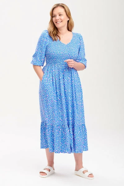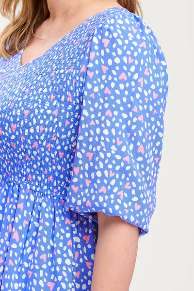 The Magdalene style is a midi length, shirred smock dress. It has a flattering V neckline, and elasticated shirred bust. 3/4 length sleeves with elasticated cuffs and a full midi skirt with a frill hem. The Animal Love Heart print features off-white animal print dots, scattered with pale pink hearts, on a soft blue base. 100% Eco Vero Lenzing Viscose.