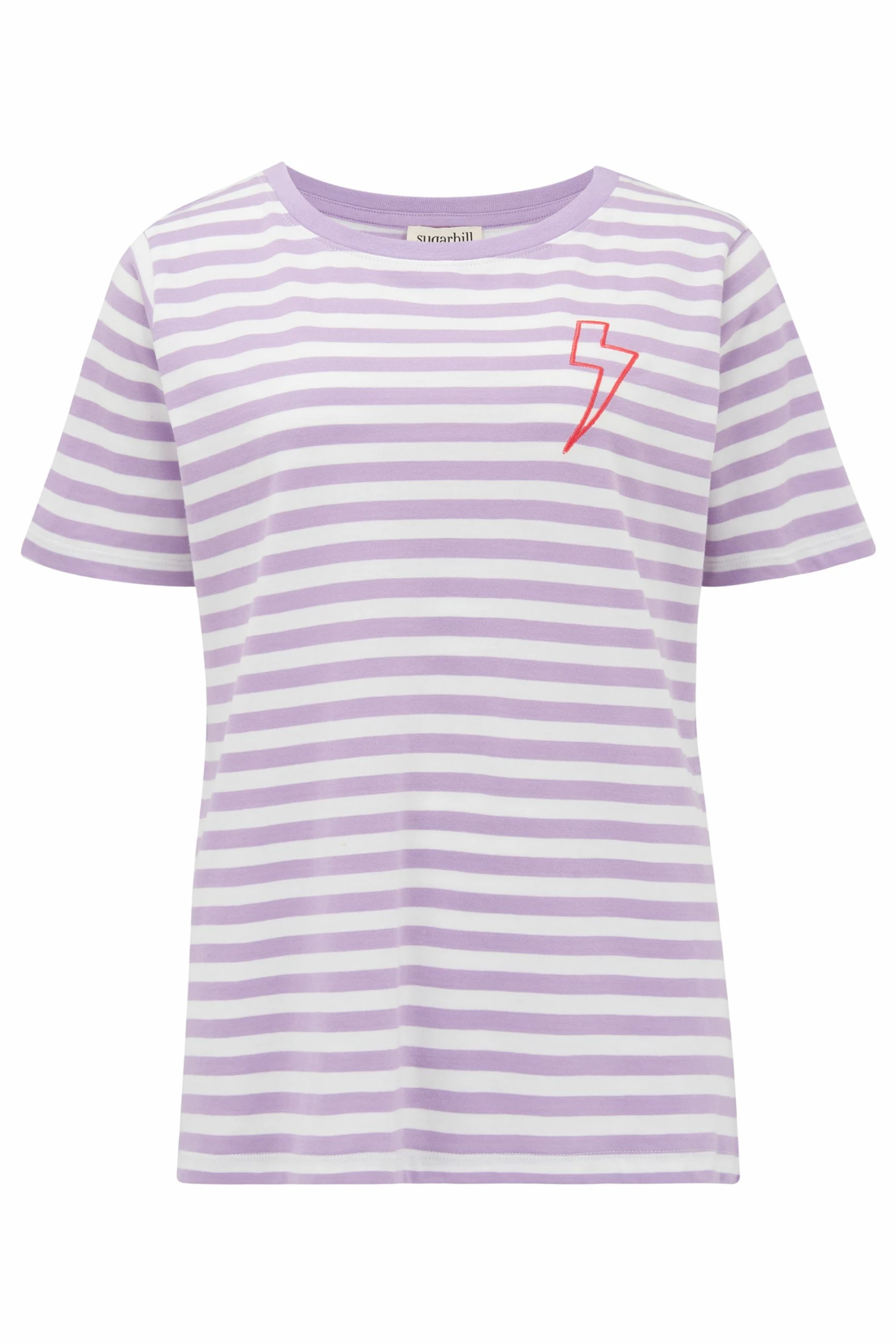 We’ve updated our signature t-shirt shape, the Maggie has straight side seams and a straight back for a classic fit. This tee features an embroidered lightening bolt on a white and lilac stripe background, the orgainic cotton is super softthat makes this tee extra special.