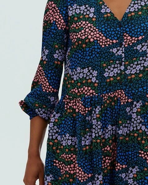 Floral print dress from British brand Sugarhill Brighton. Made from Ecovera – a sustainable viscose. This dress is brilliant for throwing on in the mornings. Its soft and flowy, and the style fits all body shapes. The fabric is dark navy in colour with a multi coloured floral print all over. The dress is long in length with a deep V neckline that buttons down to a seam at the high waist. From there the dress drops in gathers to the hemline. Along the bottom hem is a wide ruffle. The sleeves are to mid forearm in length with a ruffled cuff. 100% viscose machine wash