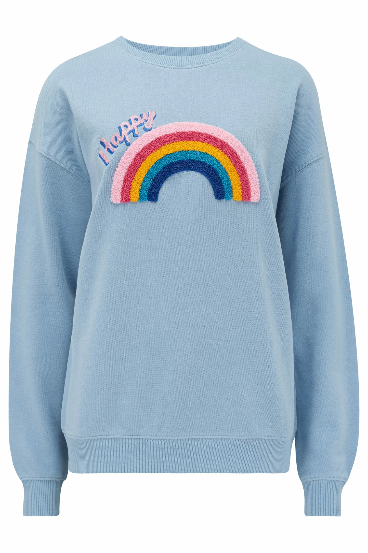 An easy to wear, playful sweatshirt, featuring an embroidered rainbow and happy text on a simple pale blue base. The new Noah sweater has a relaxed fit, ribbed collar and cuffs, and a super soft interior.