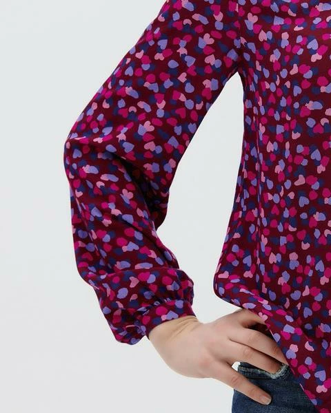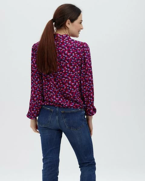 A pretty printed blouse from British brand Sugarhill Brighton. The shape is a slim fit and it has a slight puff shoulder shape. The length falls to just above the hip. The top buttons down the front and has a full length sleeve. The colour is a vibrant plum purple with a confetti petals print in shades of pink, purple and burgundy. The top is made from Eco vero which is a sustainable viscose derived from wood pulp. Machine wash as a delicate 100% LENZING™ ECOVERO™ Viscose