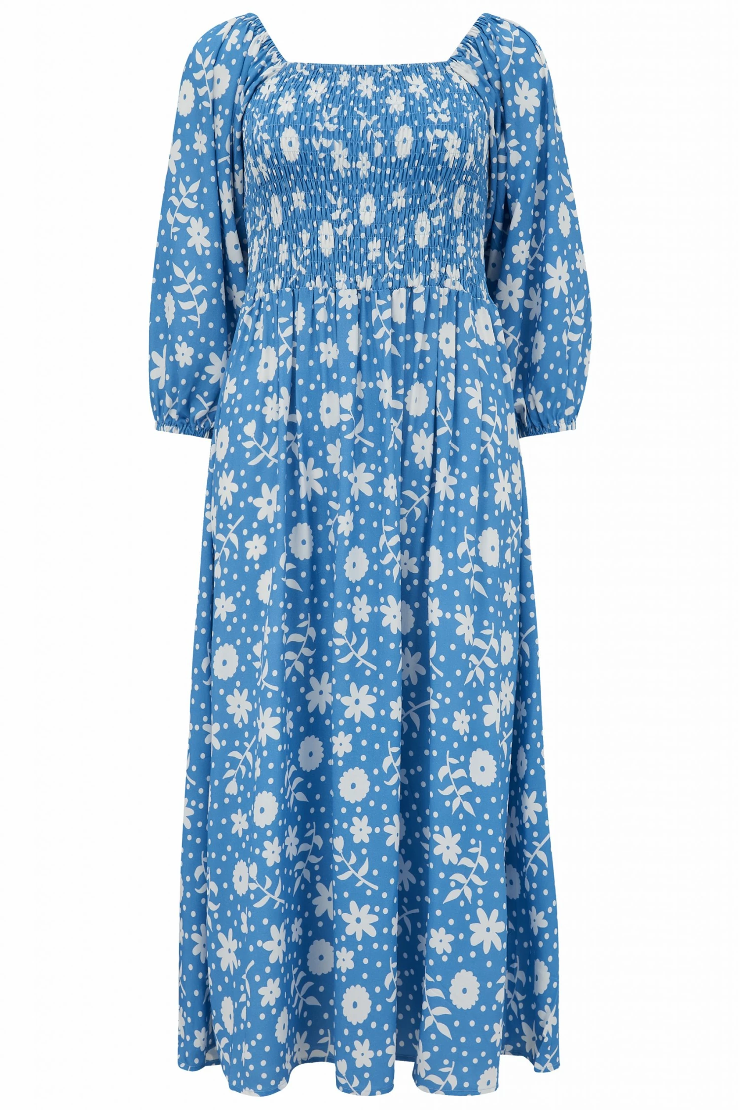 The Raquel shirred dress shape features a square, shirred elasticated top and a full flared skirt, along with flattering blouson sleeves. Designed with added versatility, the Raquel shape has elasticated cuffs and should seams so it can be worn on or off the shoulders. This new Raquel Dress is made in a sky blue vintage-style floral print fabric.