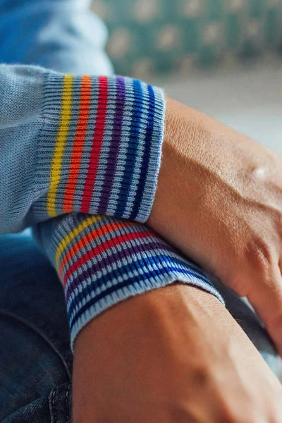 A bestselling style in a new colour combination! A little burst of colour, we love the subtle shoulder detail and striped cuffs, in chalky rainbow stripes. The Rita is Sugarhill’s bestselling jumper shape, featuring a slim fit and a round neckline with ribbed trims along the hemline, cuffs, and neckline. Neck to hem length for a size 12: 66cm Semi-fitted, try your normal size Machine washable (delicate) Length finishes at mid hip Fabric: 60% Cotton, 40% Viscose Delicate machine wash at 30 degrees with similar colours. Dry flat and reshape when wet. Iron inside out on low temperature. Do not tumble dry. Do not bleach