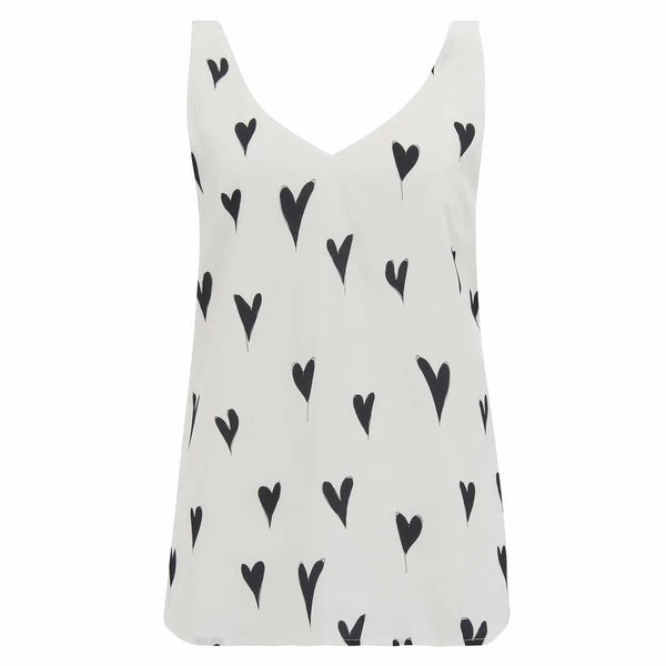 A simple vest top by Sugrahill Brighton featuring an all over bold black heart print. Made in a lightweight LENZING™ ECOVERO™ fabric this top has a soft v-neckline and can be worn with a conventional bra. Vest top Sleeveless V-neckline Monochrome heart print Care Instructions: Machine washable according to care label