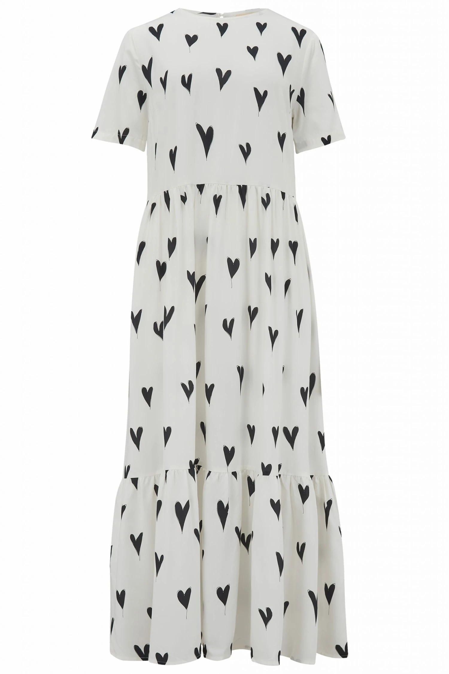 Our Vicky Smock style is the perfect, easy-breezy day dress. Cut with a loose fit, it has a T-shirt style upper, sweet blouson short sleeves and an on-trend tiered skirt. The off-white, white black hearts this dress has pockets.